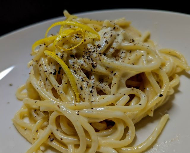 1 lemon 12 oz of preferred pasta (spaghetti worked well for us) pinch of salt 2 tablespoons TTOV's Lemon Fused Olive Oil 3/4 cup of heavy cream 3 tablespoons of butter 3/4 cup of freshly grated parmesan Freshly ground black pepper